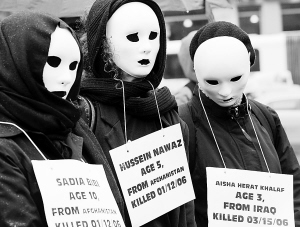 3月19日,反战人士头戴面具,胸前挂着在伊拉克战争和阿富汗战争中死去儿童的姓名牌子,在美国纽约联合广场参加抗议活动。当日,纽约反战人士举行集会,纪念伊拉克战争爆发6周年。 新华社记者 申宏 摄