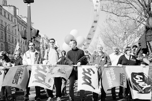 3月19日,法国民众在巴黎共和国广场附近参加游行。当日,法国各大工会在全国各地联合组织罢工和示威游行活动,抗议政府在应对当前经济危机过程中忽视劳动者权益和社会福利,要求改变劳工待遇。 新华社记者 褚雯 摄