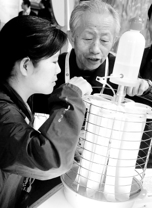 3月20日,在北京展览馆举行的国际节能减排和新能源科技博览会上,一位发明者(右)在向参观者介绍“无动力空气加湿器”。