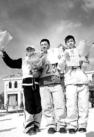 3月22日,2008-2009全国自由式滑雪雪上技巧比赛在黑龙江省加格达奇映山红滑雪场举行。哈尔滨体院选手宋晓晨(中)获得男子组冠军、大兴安岭地区选手孙磊(左)和哈尔滨市选手华泽亮分别获得第二、三名。 新华社记者 刘景洋 摄