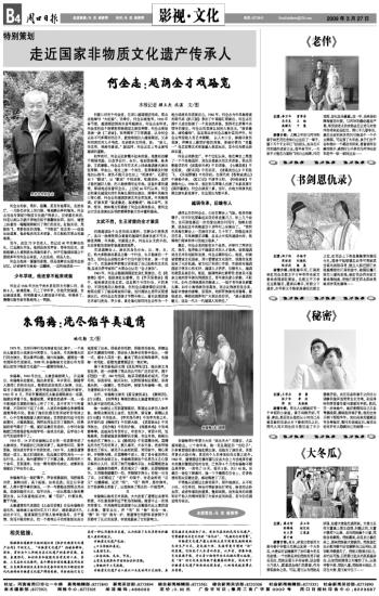 何全志的家,简朴,温馨,甚至有些零乱。走进客厅,一只卧在沙发上的白猫,嗖地蹿出奔向墙角。何全志当选为国家非物质文化遗产传承人,记者慕名来访,何老让座以后就不停地在柜子里翻找东西。这时,墙壁上挂着的一幅幅剧照吸引了我们的目光。红脸关羽,黑脸张飞,英姿勃发的周瑜,“守财奴”张忠实——这些生动逼真、惟妙惟肖的艺术形象,早已根植在观众的脑海里。