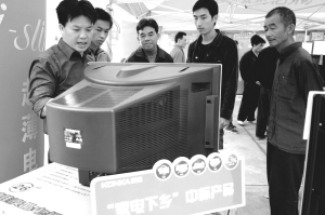 “家电下乡”赶集忙 3月27日,在广西贺州市平桂管理区沙田镇集市上,一家“家电下乡”中标企业的经销人员(左一)向农民群众推介彩电。连日来,广西贺州市平桂管理区组织经贸、财政等部门以及十多家“家电下乡”中标企业的经销商来到边远乡镇,利用群众赶集的机会开展集中宣传推介活动,受到农民的欢迎。 新华社发