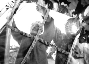 昔日农民工创业当老板 王正胜(左)在生产车间和质检员一起检查帐篷的质量(3月25日摄)。河北省秦皇岛市中心庄村曾靠在外地打工谋生的村民王正胜,2005年回乡后在当地政府的支持下开办了一个生产帐篷的企业,取得良好的经济效益。据了解,目前王正胜的工厂年营业额高达4000多万元,还解决了150多名下岗职工的再就业问题。