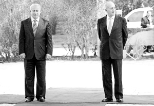 以色列新政府宣誓就职 4月1日,在位于耶路撒冷的以色列总统府,以新任总理内塔尼亚胡(左)和离任总理奥尔默特出席总理交接仪式。由利库德集团主席内塔尼亚胡领衔的以色列新一届政府3月31日晚在议会宣誓就职。