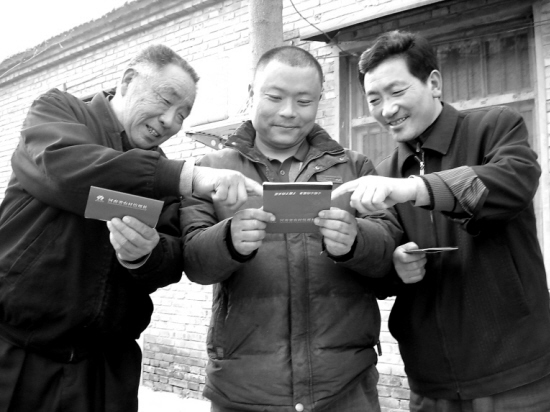 近日,太康县大许寨乡大许寨村几名村民领到粮食直补存折。今年,周口市继续推行“一折通”,截至目前,全市共兑现粮食直补和农资综合直补资金数亿元。 记者 孙安平 摄
