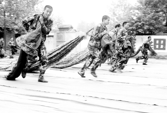 ▲沈丘县是空降兵后备兵源储备训练基地。新年度训练开始后,该县人武部严格训练,确保民兵有任务时能拉得出、用得上。图为民兵正在进行展伞训练。 (曹新旺 摄)