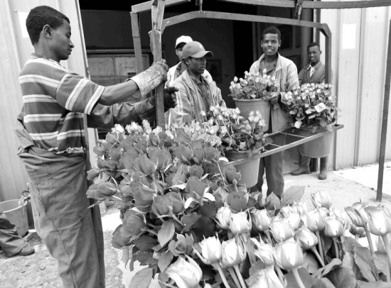 4月9日,在距离埃塞俄比亚首都亚的斯亚贝巴40公里的奥罗莫州金玫瑰农场,工人将通过传送带运来的玫瑰搬进包装车间。近年来,埃塞俄比亚鲜花种植和出口大幅增长,出口额跃居非洲第二。其鲜花以花朵大、花期长、花茎长深受国际市场青睐。目前,埃塞俄比亚全国超过6万人从事鲜花产业。埃塞俄比亚政府希望通过减免税收等方式吸引更多投资商,实现在5年内鲜花超