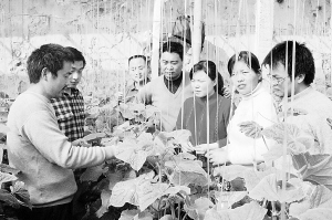 图为大学生村官、扶沟县汴岗镇罗冢行政村村主任助理王占峰(左一)和其他村的大学生村官在大棚里交流黄瓜栽培技术。金月全 摄