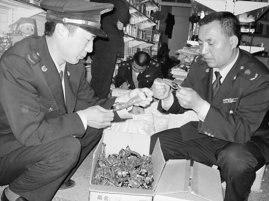 近日,根据群众举报,太康县工商局清集中心工商所执法人员在独塘乡张电池村张翠兰副食品小卖部查获150袋“早产”60多天的鸡爪。目前,工商部门已对该副食品小卖部进行立案调查,并全面追查“早产”鸡爪来源。图为清集中心工商所执法人员正在检查“早产”鸡爪。(王慧星 张中杰 李康 摄)