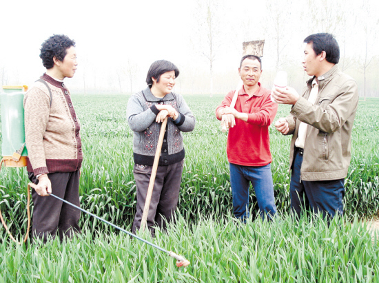 针对目前小麦出现病虫害的实际情况,日前,我市各县市区及时组织技术人员深入田间地头指导农民科学除害,确保小麦增产增收。图为技术人员向农民讲解麦田管理知识。(记者 孙安平 摄)
