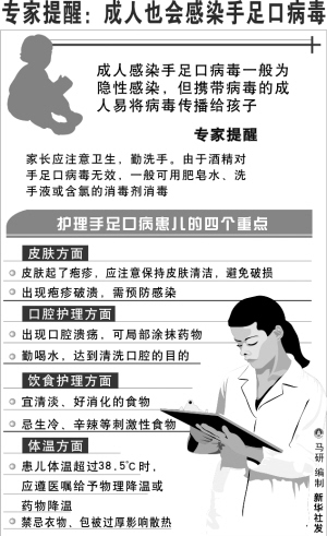 新华社郑州4月19日电(记者单纯刚)记者从河南省卫生厅获悉,患手足口病的不仅仅是孩子,其实,大人也能感染手足口病病毒,且很容易将病毒传染给孩子,所以防范手足口病,更应该从自身做起。