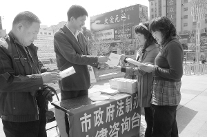 ▲昨日上午,在五一广场,市政府法制办的工作人员在向市民发放《行政复议法》手册,庆祝《行政复议法》实施5周年。