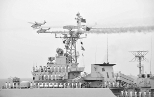 胡锦涛主席乘坐“石家庄”号导弹驱逐舰,检阅中外舰艇。