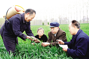 日前,鹿邑县组织200多名农业科技人员深入田间,调查小麦病虫害发生情况,并及时提出麦田分类管理意见。图为农业科技人员正在向农民传授小麦病虫害防治技术。(胡海云 摄)