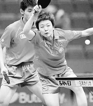 5月3日,中国选手木子/张继科在比赛中。当日,在第50届世乒赛混双决赛中,李平/曹臻以4比2战胜队友木子/张继科夺冠,木子/张继科获得亚军,姚彦/张超、常晨晨/郝帅获得季军。 新华社记者 徐家军 摄