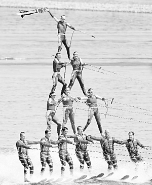 5月3日,美国队队员在四层罗汉项目中表演。当日,2009中美滑水明星对抗赛在北京顺义奥林匹克水上公园举行。