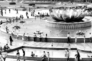 5月3日,人们在济南泉城广场音乐喷泉纳凉。当日,济南出现31℃的高温天气。面对突然到来的高温,市民和游客依旧游兴不减,纷纷外出享受假期。 新华社记者 范长国 摄