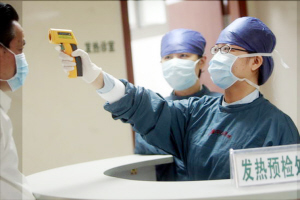 2009年5月4日,上海市杨浦中心医院发热门诊的医护人员全副武装坚守岗位。为加强对甲型H1N1流感的防控工作,杨浦中心医院在门诊特设了发热预诊处,并设立甲型H1N1流感治疗应急通道。图为上海市杨浦中心医院发热门诊的医护人员给疑似发热病人测体温。