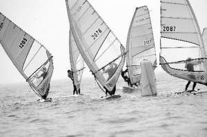 5月10日,参加男子NP级比赛的选手在绕标。当日,第十一届全运会帆板预赛男子NP级比赛在山东省日照市万平口海域进行了第六轮争夺。