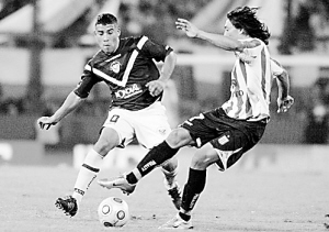 5月9日,萨斯菲尔德队球员奥塔门迪(左)与竞技队球员鲁古西奥争抢。当日,在2009年阿根廷足球秋季甲级联赛第13轮比赛中,萨斯菲尔德队以2比2战平竞技队。 新华社发(马丁·萨巴拉摄)