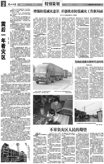 2008年,四川汶川发生了8.0级特大地震,其震级之高、波及范围之广、破坏性之强、救灾难度之大都是历史罕见的。在党中央的坚强领导下,全国人民众志成城、团结一心,抗震救灾取得了重大胜利。地震后,我市也出现明显震感,市委、市政府高度重视,采取了积极有效的措施,很快安定了人心,稳定了社会。在汶川地震一周年纪念日之际,我们要汲取汶川地震经验教训,进一步推进我市防震减灾工作向前发展。