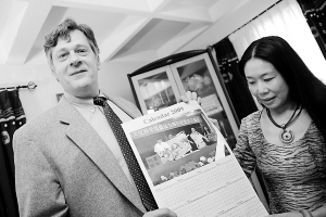 5月8日,在美国纽约,罗伯特·恩格尔(左)展示去年在四川成都向地震灾区捐赠仪式上的照片。