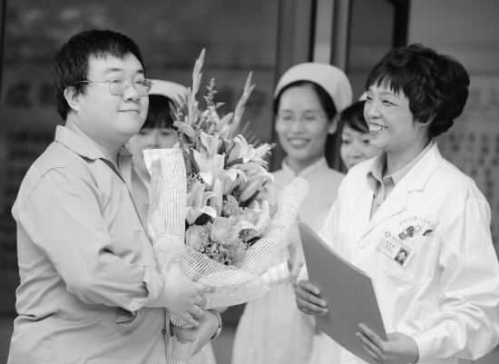 5月17日,我国内地首例甲型H1N1流感患者包某某(左)即将离开医院。 当日,经过卫生部、四川省、成都市的医疗专家组科学有效和精心细致的治疗,我国内地首例甲型H1N1流感患者包某某治愈出院。 新华社记者 陈燮 摄