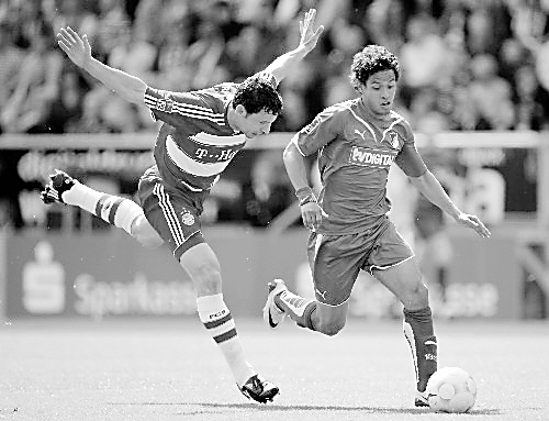 5月16日,拜仁慕尼黑队球员范博梅尔(左)与霍芬海姆队球员爱德华多拼抢。当日,在德甲联赛第33轮的一场比赛中,拜仁慕尼黑队客场以2比2平霍芬海姆队。 新华社/法新