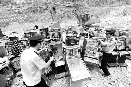 5月15日,民警在清点收缴的赌博游戏机。当日,南京市公安局浦口分局对在近期赌博机专项整治行动中收缴的669台各类赌博游戏机进行集中销毁。新华社记者 韩瑜庆 摄