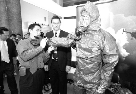 5月20日,工作人员在介绍SE400核生化正压防护衣组。当日,2009年国际刑侦、禁毒、反恐装备展览会暨技术交流会在北京开幕。新华社记者 袁满 摄