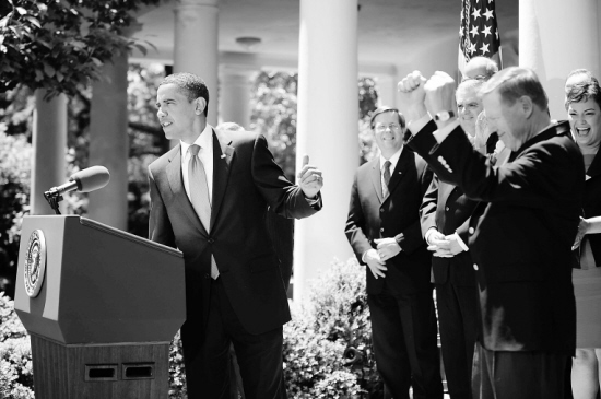 5月19日,美国总统奥巴马在首都华盛顿白宫玫瑰园发表讲话,福特汽车公司首席执行官阿兰·穆拉利(前右)在一旁举手欢呼。当日,奥巴马宣布一项新的针对小型汽车和轻型卡车的排放标准和油耗标准,该标准将于2012年起开始实施。根据要求,到2016年小型汽车和轻型卡车的平均能耗将达到每加仑汽油行驶35.5英里(即每100公里耗油约8升)。 新华社