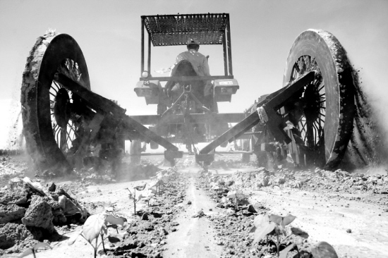 5月20日,在位于新疆博尔塔拉的农五师九十团的棉田里,生产建设兵团职工驾驶自己设计制造的封土机在棉田里作业。 新华社发(王奎平 摄)