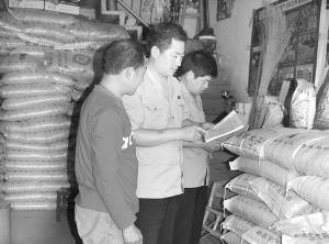 ▲商水县平店工商所积极开展“红盾护农保夏播”专项执法活动,将种子、化肥、农药等列入重点监管对象。图为工商人员在农资经营站检查购销台账。(记者 陈卫东 摄)