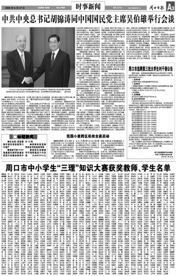 中共中央总书记胡锦涛同中国国民党主席吴伯雄举行会谈