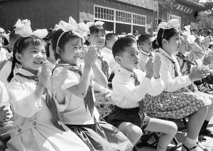1977年6月1日,首都少年儿童在北京市少年宫举行盛大游园联欢活动,热烈庆祝“六一”国际儿童节。这是北京儿童在游园联欢会上兴致勃勃地观看文艺演出。