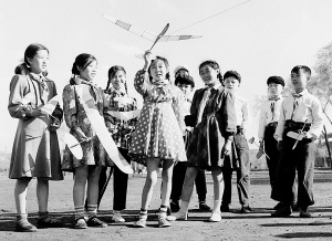 1956年5月30日,哈尔滨市少年宫的航空模型小组的少先队员,制作好一批滑翔机模型,迎接“六一”儿童节。这是他们在准备试飞的情形。