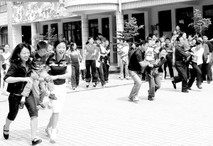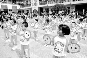 下右图:市实验幼儿园的小朋友在进行健身操比赛。
