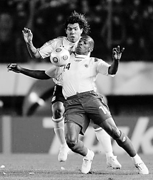 6月6日,阿根廷队球员特维斯(上)和哥伦比亚队球员佩雷亚拼抢。当日,在2010年世界杯南美区预选赛中,阿根廷队主场以1比0战胜哥伦比亚队。