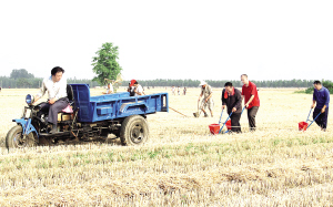 鹿邑县太清宫镇群众动用大量的人力物力趁墒抢种秋作物。目前,该镇的5万亩小麦已经基本完成收割任务,夏种工作也在紧张进行中。(蒋保庆 摄)