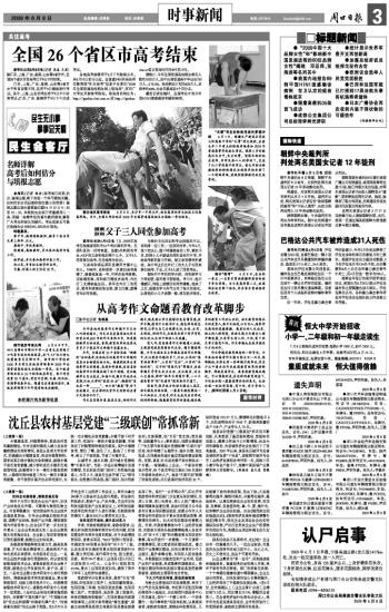 新华社长沙6月8日电 7日,2009年高考在湖南省邵阳市10个考区顺利开考。在邵阳县的一间考室里,坐着3名特别的考生:43岁的父亲和他的两个儿子。父子3人同堂参加高考,在当地传为佳话。