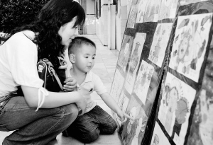 市直幼儿园从培养兴趣入手激发孩子们活泼好动和爱美的天性,图为一位小朋友在家长的陪同下观看自己举办的绘画展。