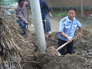 项城市范集乡派出所副所长丁高岭是周口市“十佳社区民警”。当得知盲人赵新中因家庭困难吃不起自来水时,他积极向水厂和民政部门反映情况,免费为赵新中家安装了自来水。图为他和水厂工人一起为赵新中家铺设自来水管道。(史耀灯 摄)