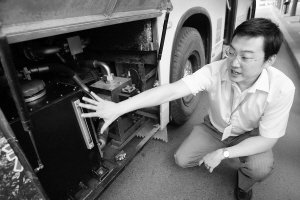 “不用给油也能起步” 6月16日,参展商在向观众展示新型公交车节油装置。一款“不用给油也能起步”的新型节能公交车日前亮相“2009中国北京国际节能环保展览会”。这种新型公交车在安装了“液压能量再生装置”后,节能效率超过20%。