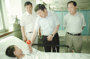 “走,到重症病房看看去。”徐光首先向重症监护室走去,两名症状较重的中毒儿童正在那里接受治疗。第一个床位上躺着的是5岁的小女孩凌子涵。她就诊时高烧40摄氏度,生命体征不稳,上午还烧到38摄氏度,经过医院的精心治疗,现已转危为安,体温降到了正常,心跳等生命体征趋于平稳。徐光用手摸了摸小子涵的脑门,关心地说:“小朋友,你几岁了,现在感觉好点吗?”子涵轻轻地点了点头。6岁10个月的张子豪在临近的病床上,手里拿着一个红色的玩具球,精神状态良好。医生介绍说,他就是另一名病症较重的中毒儿童,现在恢复情况较好,经过专家会诊,下午就可以转到普通病房了。听到孩子可以转到普通病房了,孩子的父亲激动地说:“谢谢领导,谢谢医生!”徐光和小子豪亲切地握了握手,并对两个孩子的家长说:“市委、市政府向你们表示歉意,但请你们放心,省委、省政府和市委、市政府对此事高度重视,孩子的健康安全是有保障的。”
