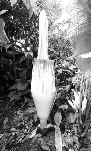 这是6月19日在美国加利福尼亚州圣马力诺市的亨廷顿图书馆热带雨林植物馆拍摄的开放的魔芋。巨魔芋原产于印度尼西亚苏门答腊岛。它不仅是世界上最臭的花,也是最大的花,每6年至7年开花一次,盛开时花序直径可达3米。巨魔芋盛开时为奶油色或粉红色,花朵将持续开放几天时间,为吸引以吃腐肉为生的甲虫前来授粉,它将散发出如尸体腐烂般的恶臭。