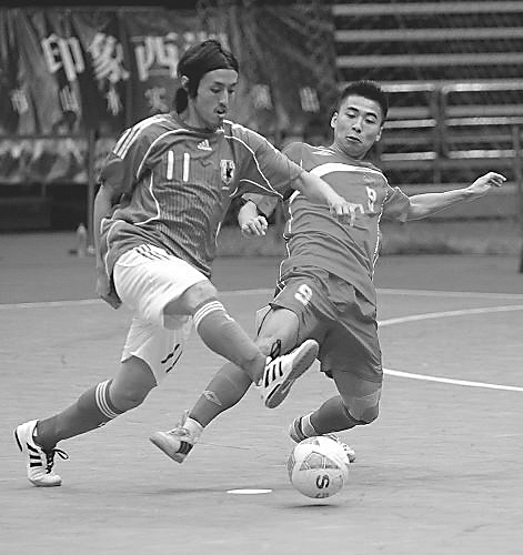 6月21日,中国队球员张啸(右)与日本队球员高桥健介争抢。当日,在杭州黄龙体育馆举行的2009中国室内五人制足球国际锦标赛中,中国队以0比0战平日本队。 新华社记者 徐昱 摄