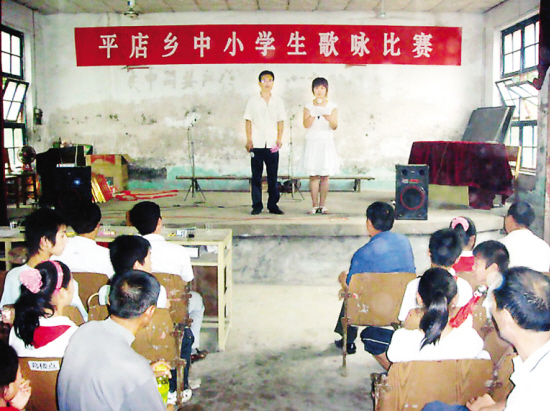 为庆祝建国60周年,6月20日,商水县平店乡中心校举办了一场以“热爱祖国、珍惜自我”为主题的歌咏比赛,来自全乡中小学的28个代表队参加了比赛。图为比赛现场。(赵永昌 姚新事 摄)