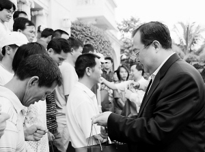 6月25日,中国驻菲律宾大使刘建超在大使馆为25名获释的中国渔民送行,转达中国政府和人民的亲切慰问。经中国驻菲律宾大使馆、广东省人民政府以及菲律宾华人的努力,两年多前被菲律宾有关当局扣押的25名中国渔民日前获释,于25日晚间离菲回国。 新华社记者 谭卫兵 摄