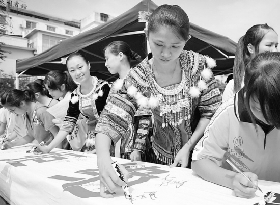 6月26日,在广西融水县举行的禁毒宣传活动上,一名苗族姑娘在“珍爱生命,拒绝毒品”的条幅上签名。 新华社发(龙涛 摄)