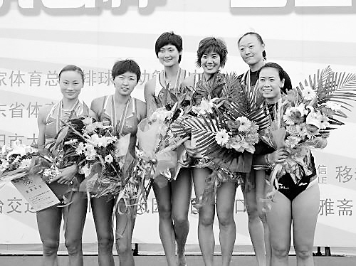 6月28日,获得冠军的山西一队选手王露/李颖(中间二人)、亚军新疆一队选手王洁/左曼(左边二人)、季军八一一队选手田佳/王菲在领奖台上合影。当日,在2009年全国沙滩排球巡回赛(海阳站)暨第十一届全国运动会资格赛女子项目的决赛中,山西一队选手王露/李颖以2比0战胜新疆一队选手王洁/左曼获得冠军。 新华社记者 范长国 摄
